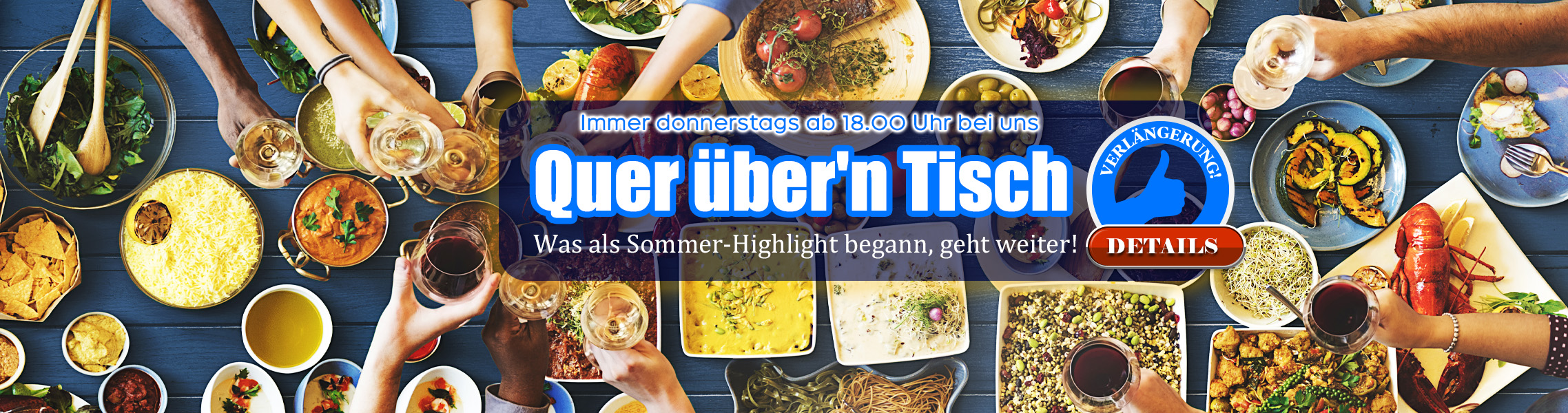 Nach dem tollen Erfolg im Sommer haben wir uns entschlossen „Quer über’n Tisch“ mindestens bis zum Jahreswechsel zu verlängern! Immer donnerstags ab 18.00 Uhr bei uns in der Scheune. Ein kleines ABER haben wir noch. An diesen Tagen gibt es KEIN a la carte! Wenn Ihr allerdings eine Feier oder Veranstaltung machen möchtet geht natürlich auch Menü. In der Gänsezeit gibt es donnerstags auch unsere „Gans ganz anders“. Bei Fragen einfach melden, danke!